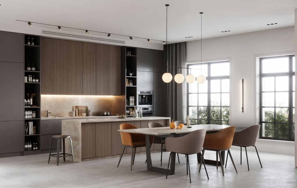 This modern kitchen renovation features a sleek mix of matte black and natural wood cabinetry, paired with a stone-finish island for a warm yet contemporary look. Open shelving, subtle lighting, and minimalist fixtures add both function and style. The adjoining dining area includes a marble-top table, soft-toned chairs, and a sculptural pendant light, creating a cozy, elegant space filled with natural light.